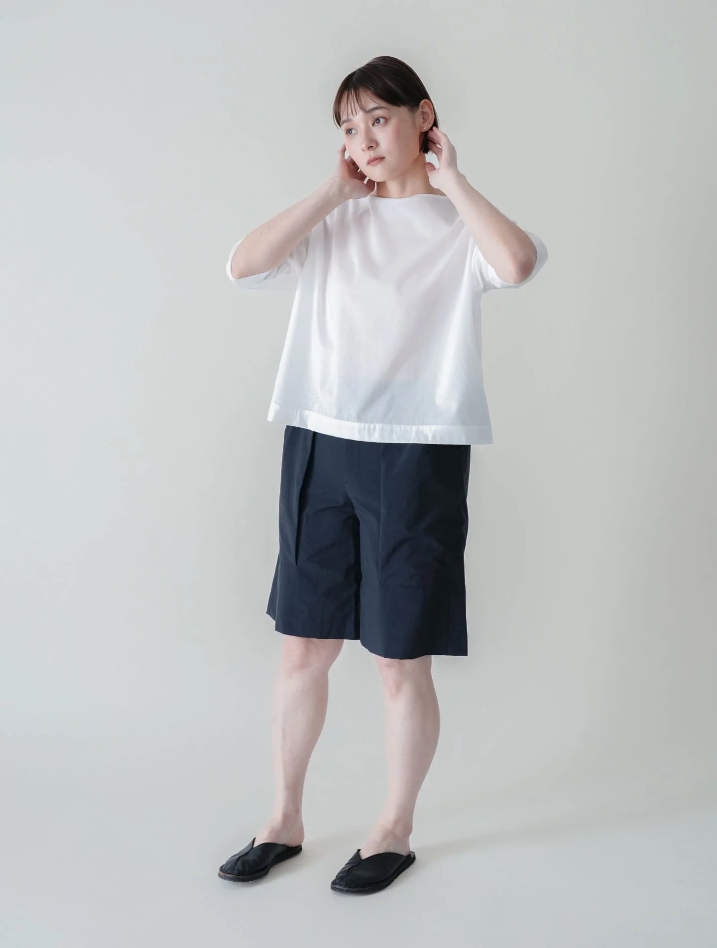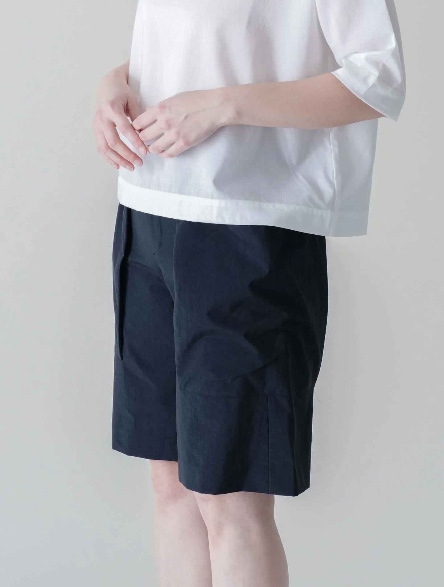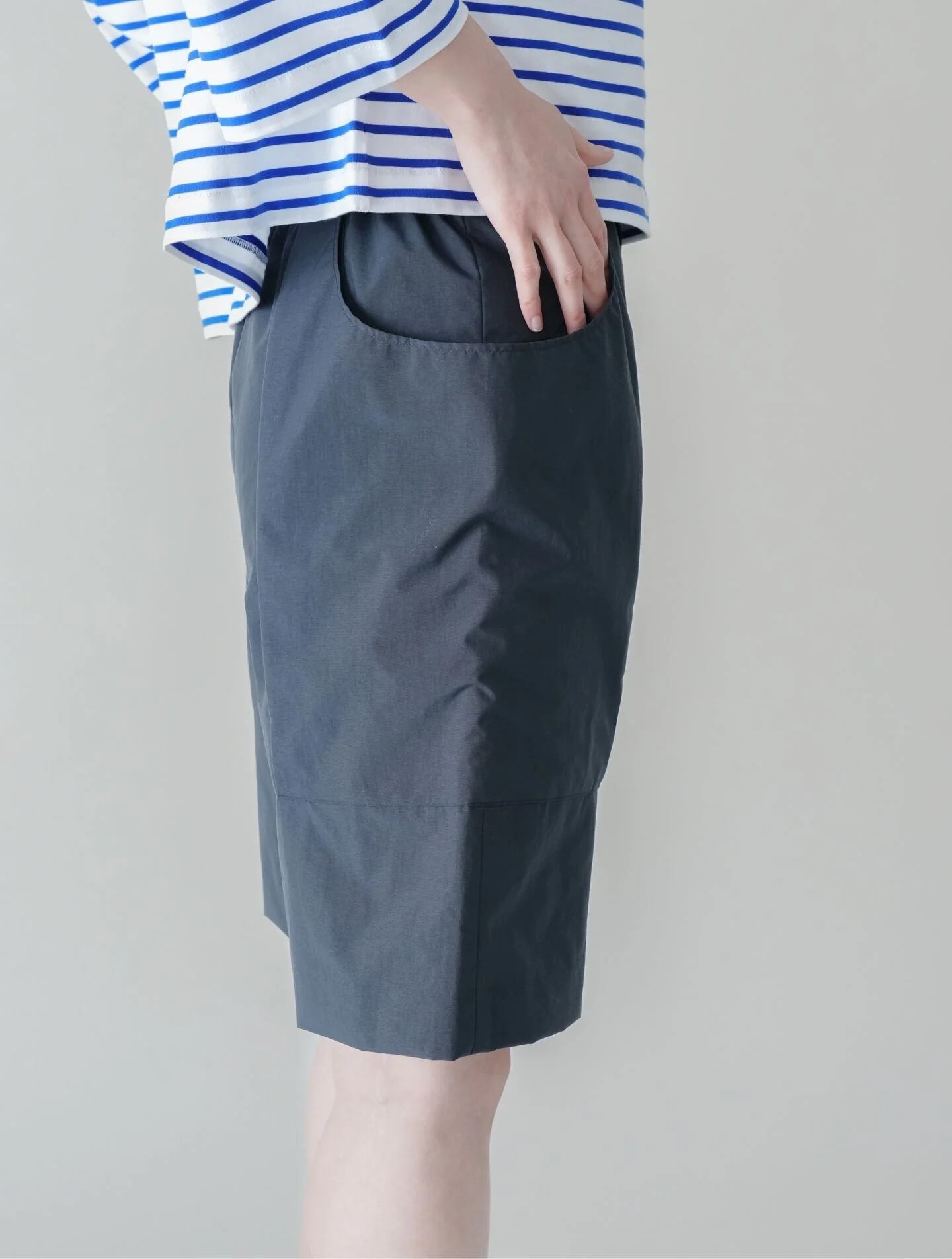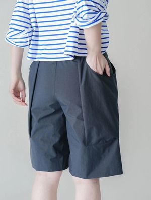 軽やかな張り感とドライなタッチで肌にまとわりつかず、真夏でも快適なハーフパンツ。安心感のあるひざ下丈で、前後のタックと大きなポケットによる立体感が、からだのラインをカモフラージュ。腰まわりやヒップまわりを気にすることなく着用していただけます。街着としてはもちろん、撥水機能があるため川遊びなどのレジャーシーンにもぴったり。シワになりにくいので旅にもどうぞ。