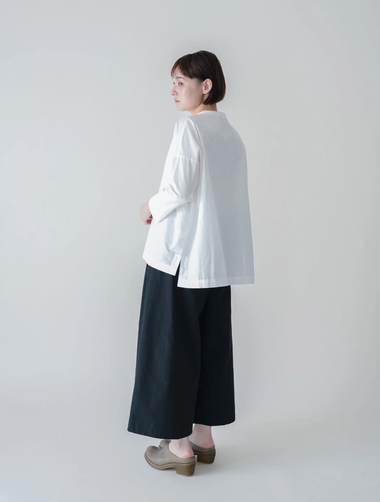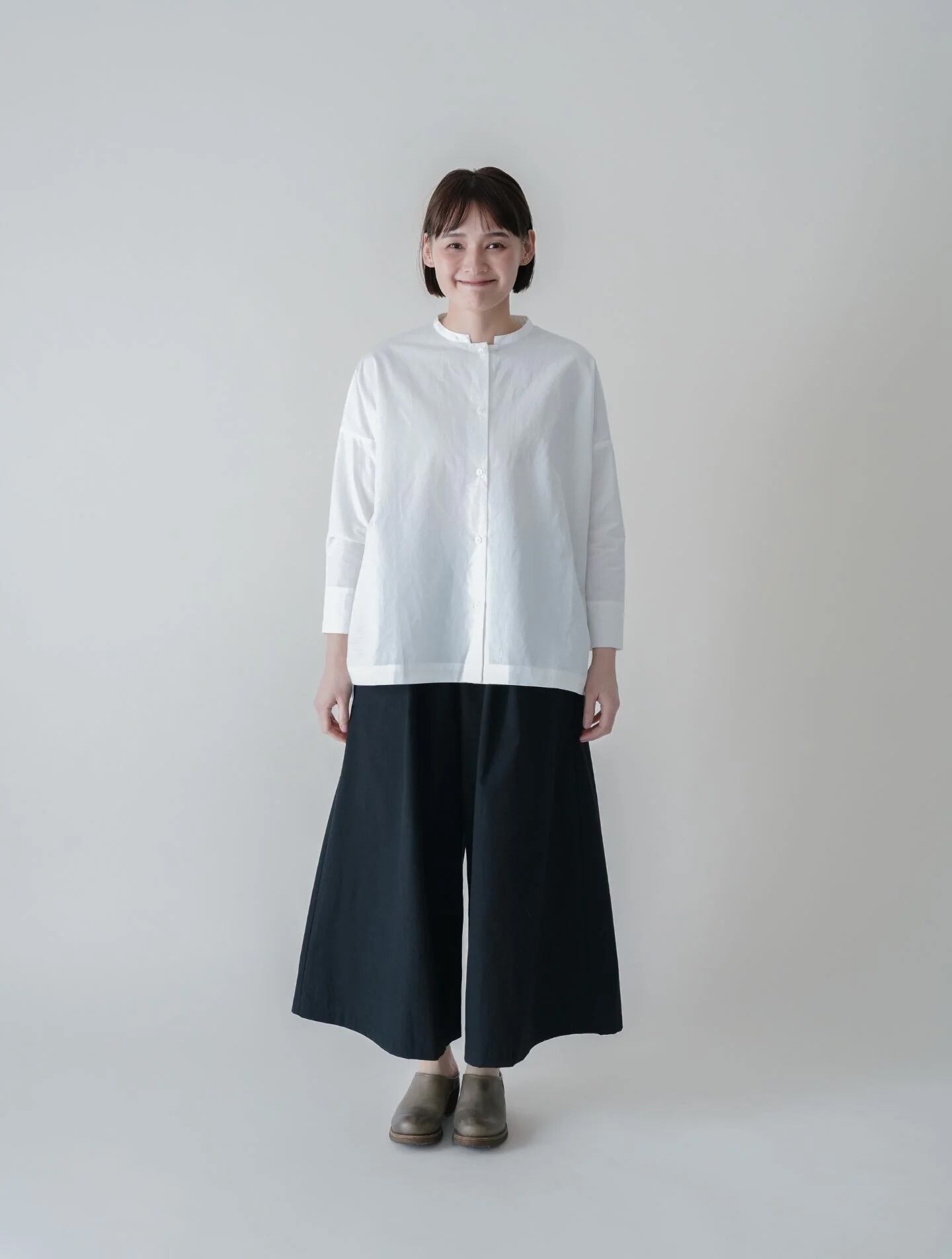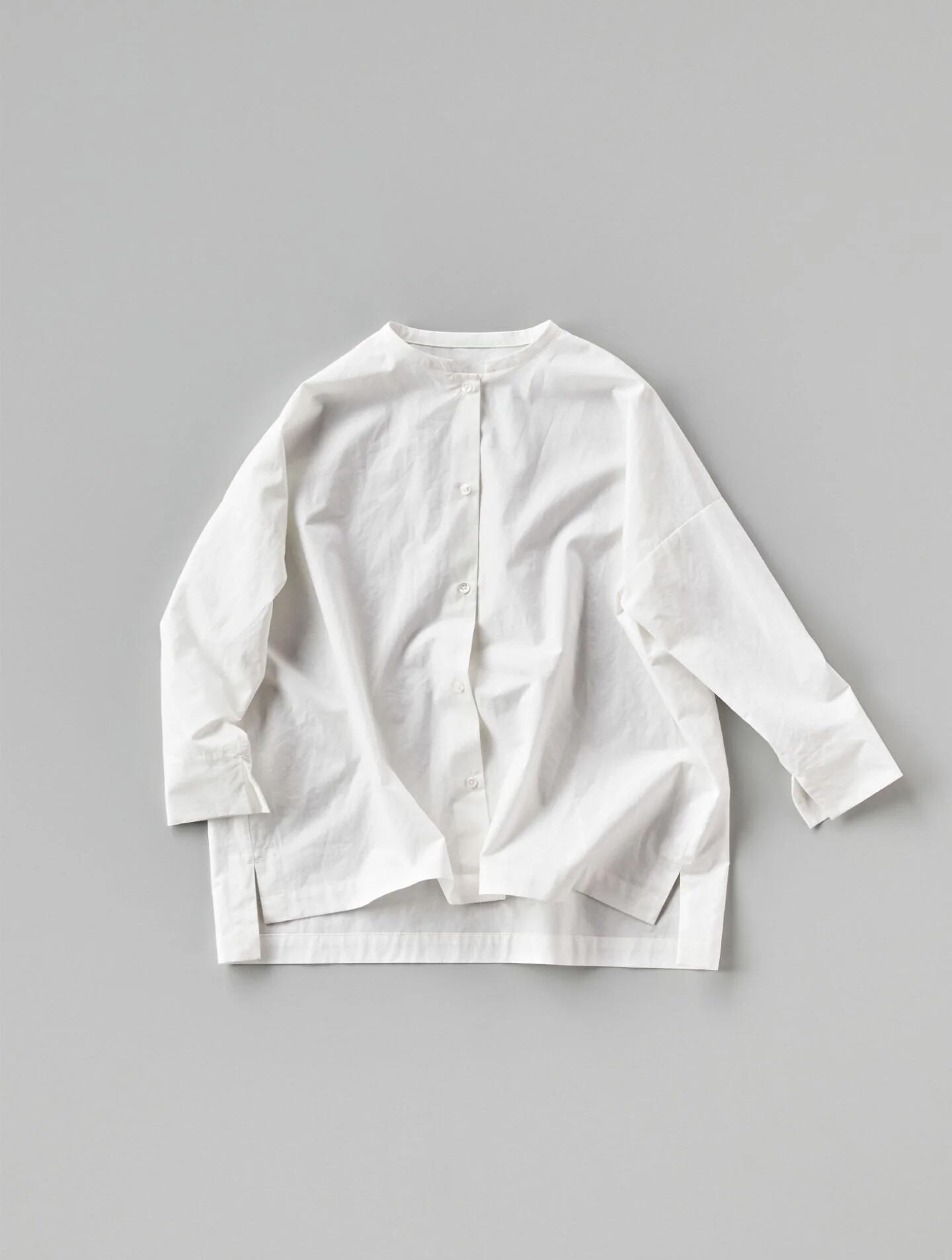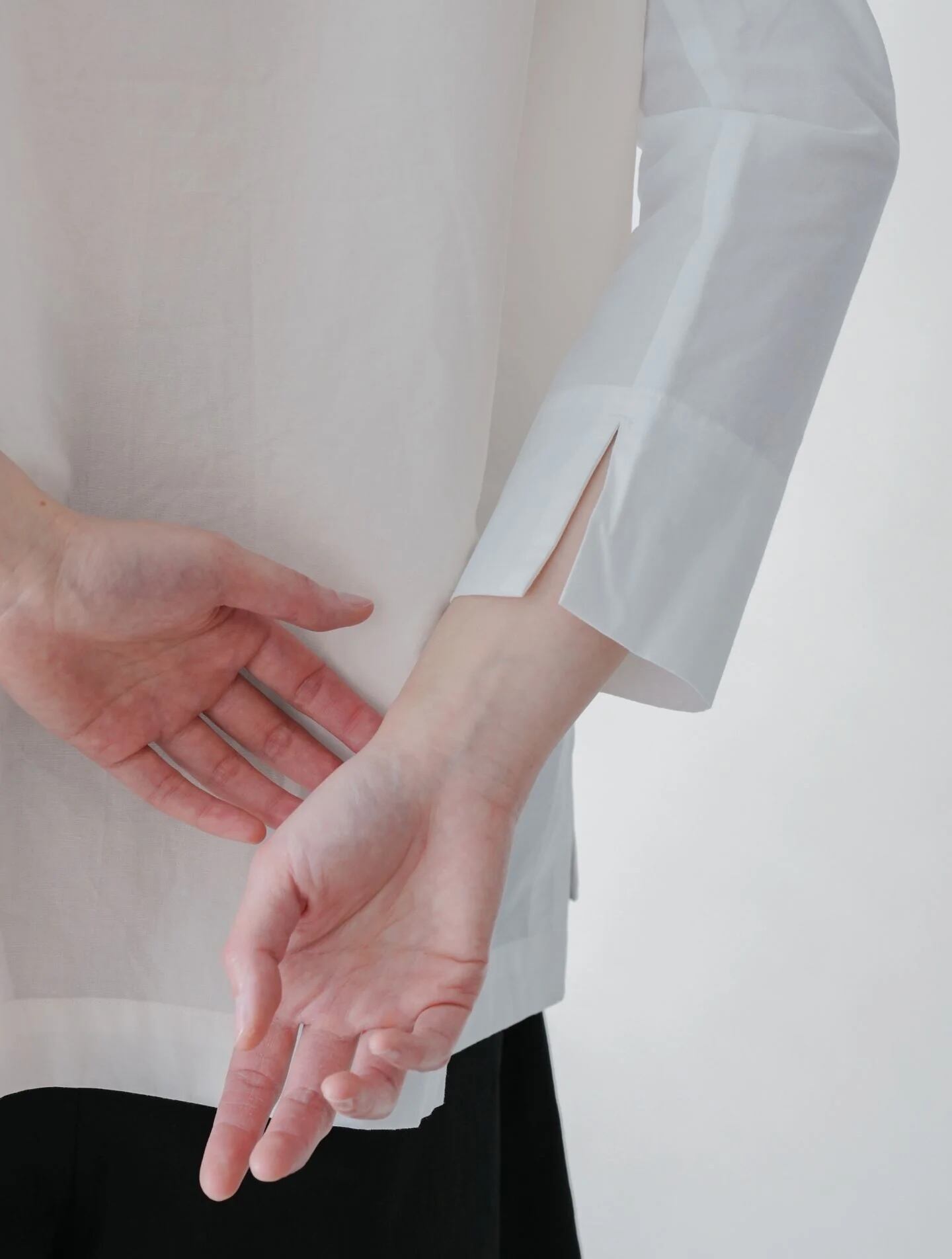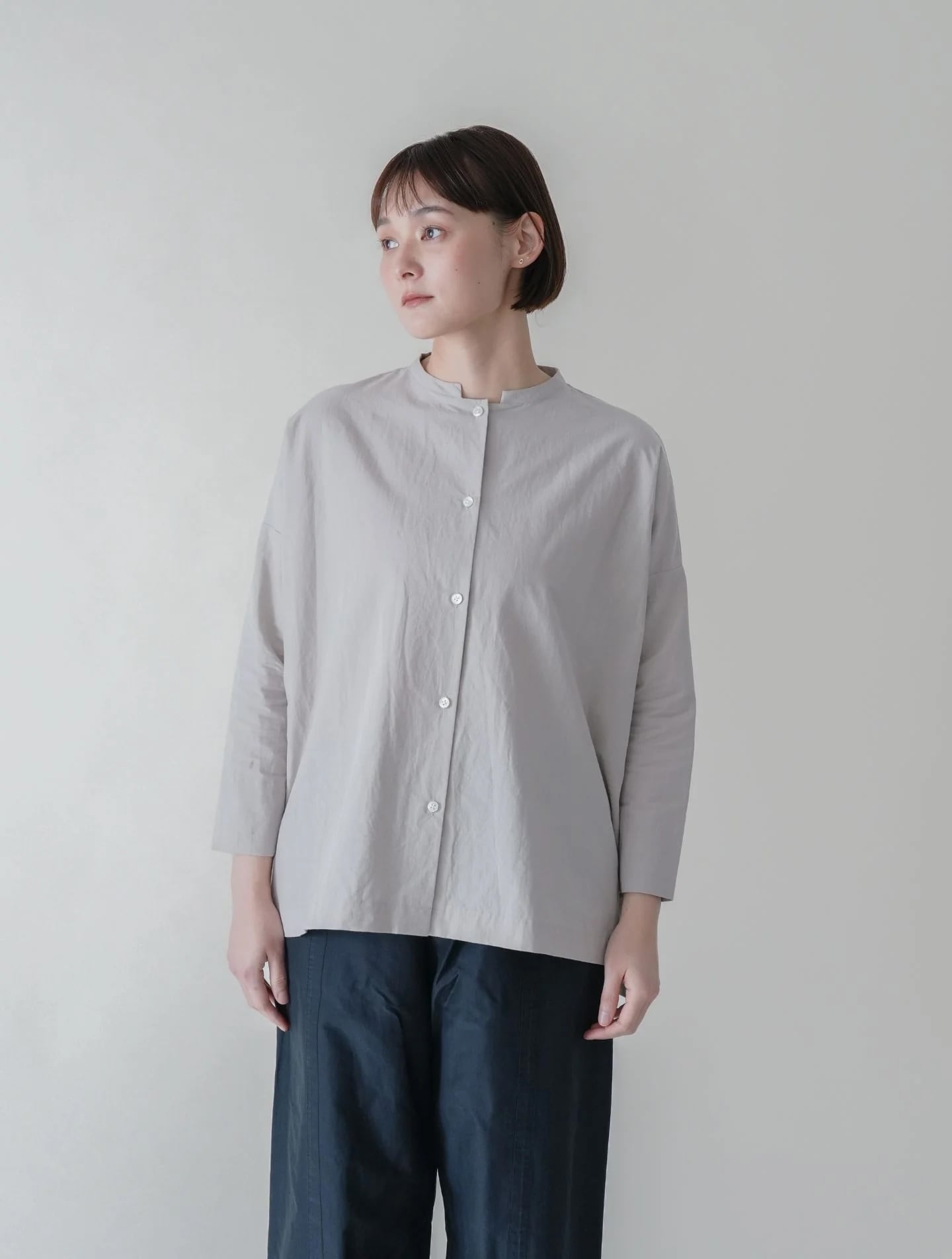 空気をまとうようにゆったり着られるボックスシルエットのシャツ。経糸に麻を使うことでさらに通気性よく、ニュアンスある表面感に仕上がっています。前後差のあるすそは、見返し幅を広めにとることでおさまりよく、横から見たシルエットもきれいです。スリット入りの袖口はそのままでも、まくり上げても。羽織る着こなしにも使いやすく、長い季節お楽しみいただけます。