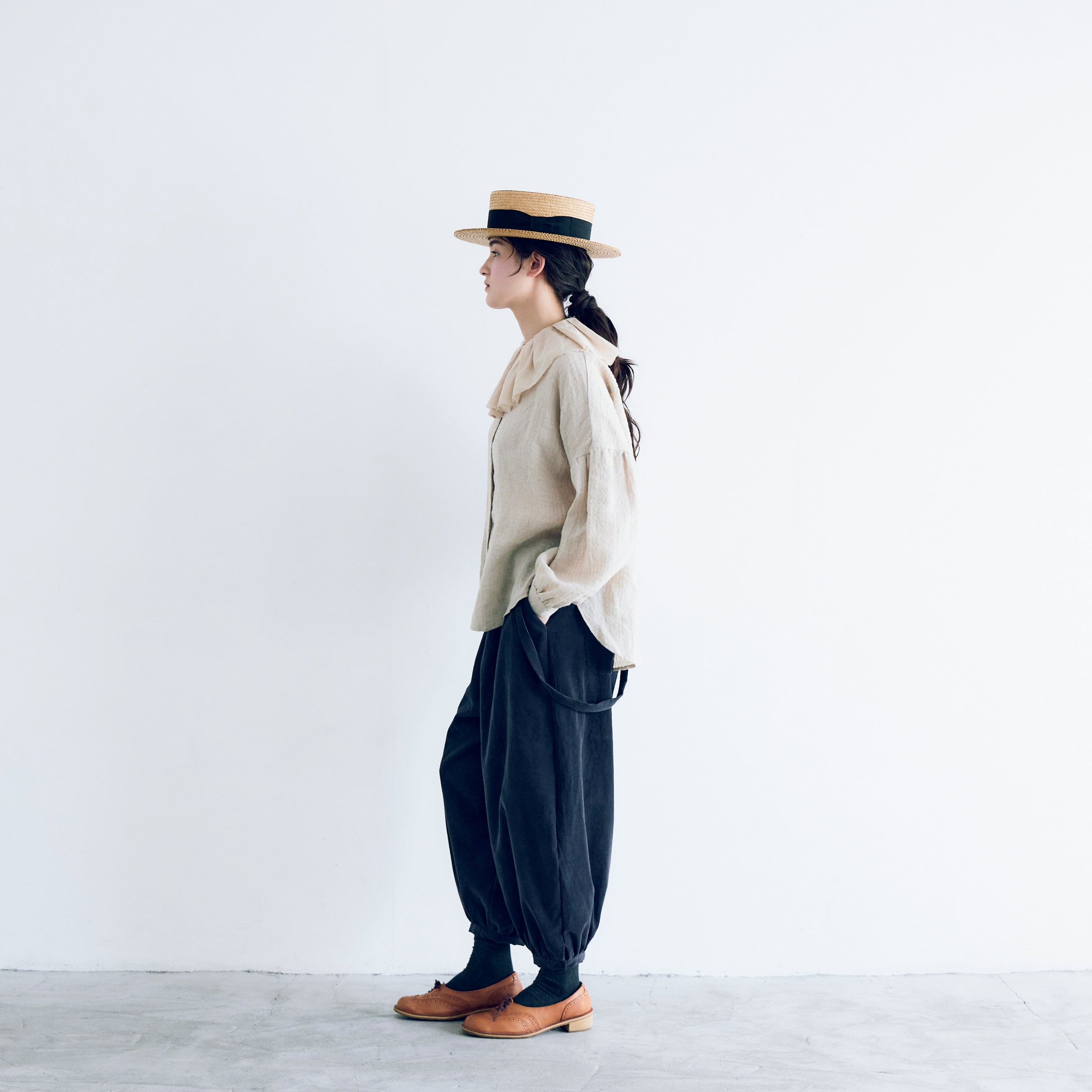 適度にゆったりとゆとりがあり、体に収まりの良いシルエットに仕上げたブラウスはすっきりとした印象に映ります。