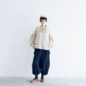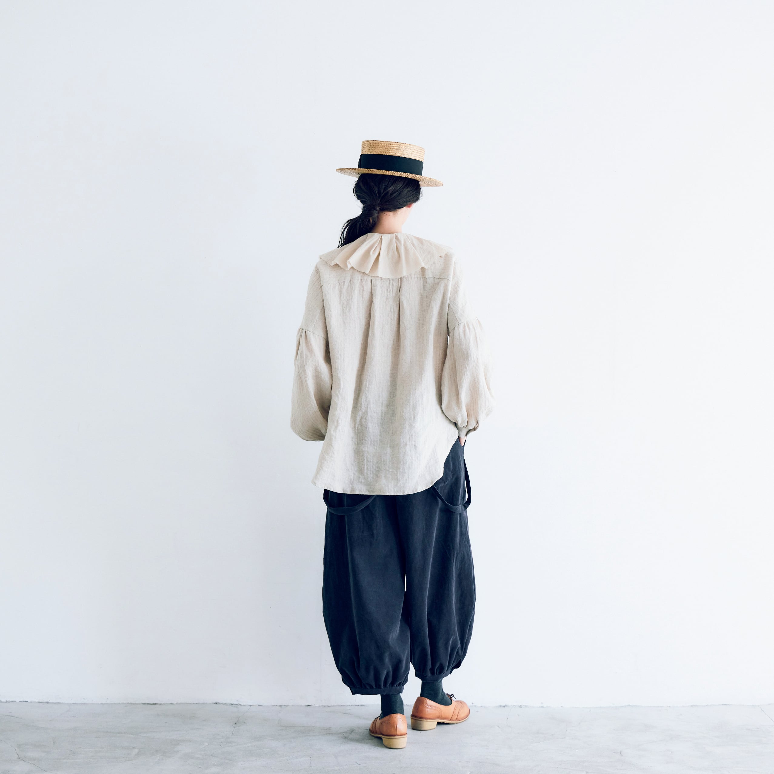ランダムにタックを寄せた、コットンローンの切りっぱなしのフリルはまるで幾重に重なる花弁ように首元を包み込みます。