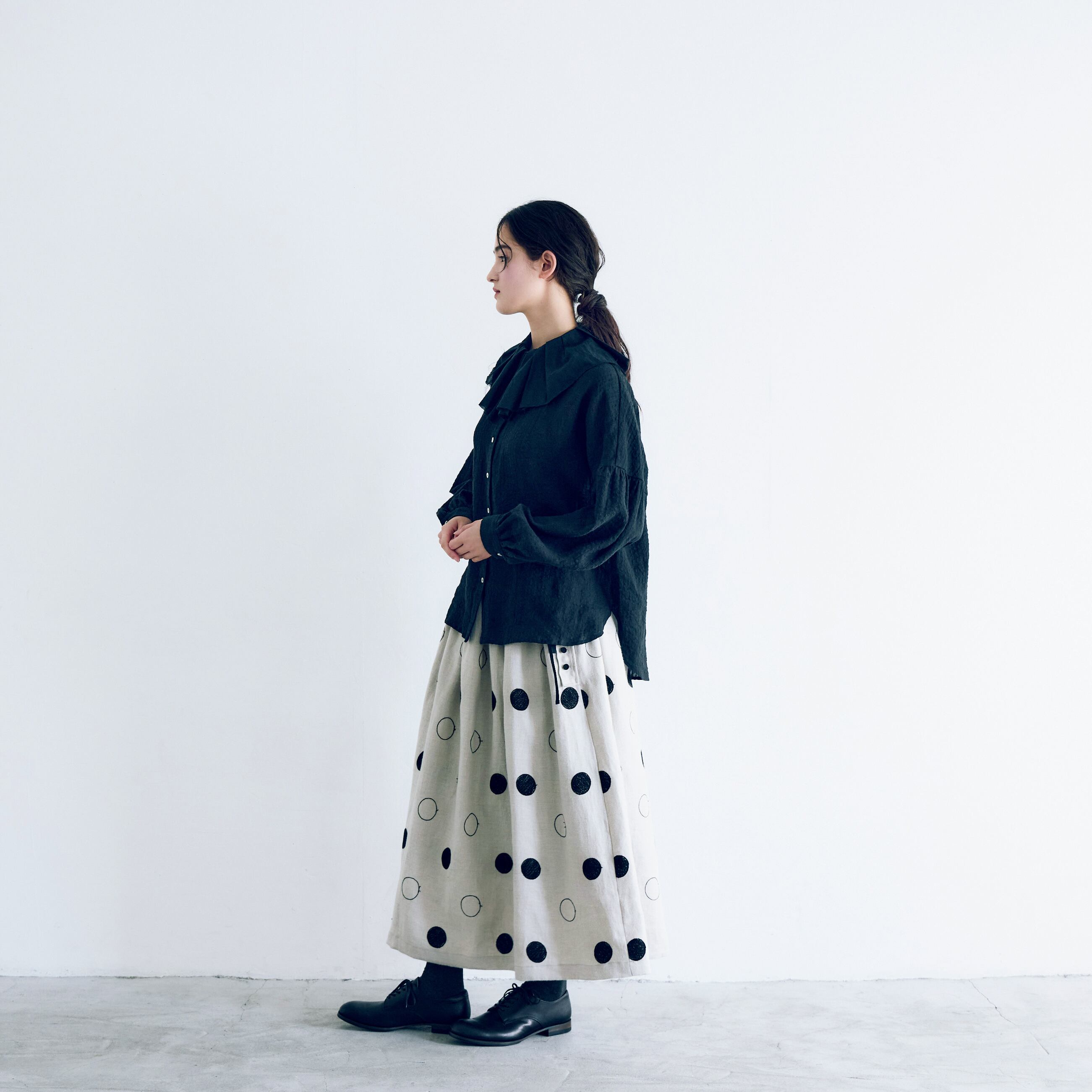ランダムにタックを寄せた、コットンローンの切りっぱなしのフリルはまるで幾重に重なる花弁ように首元を包み込みます。