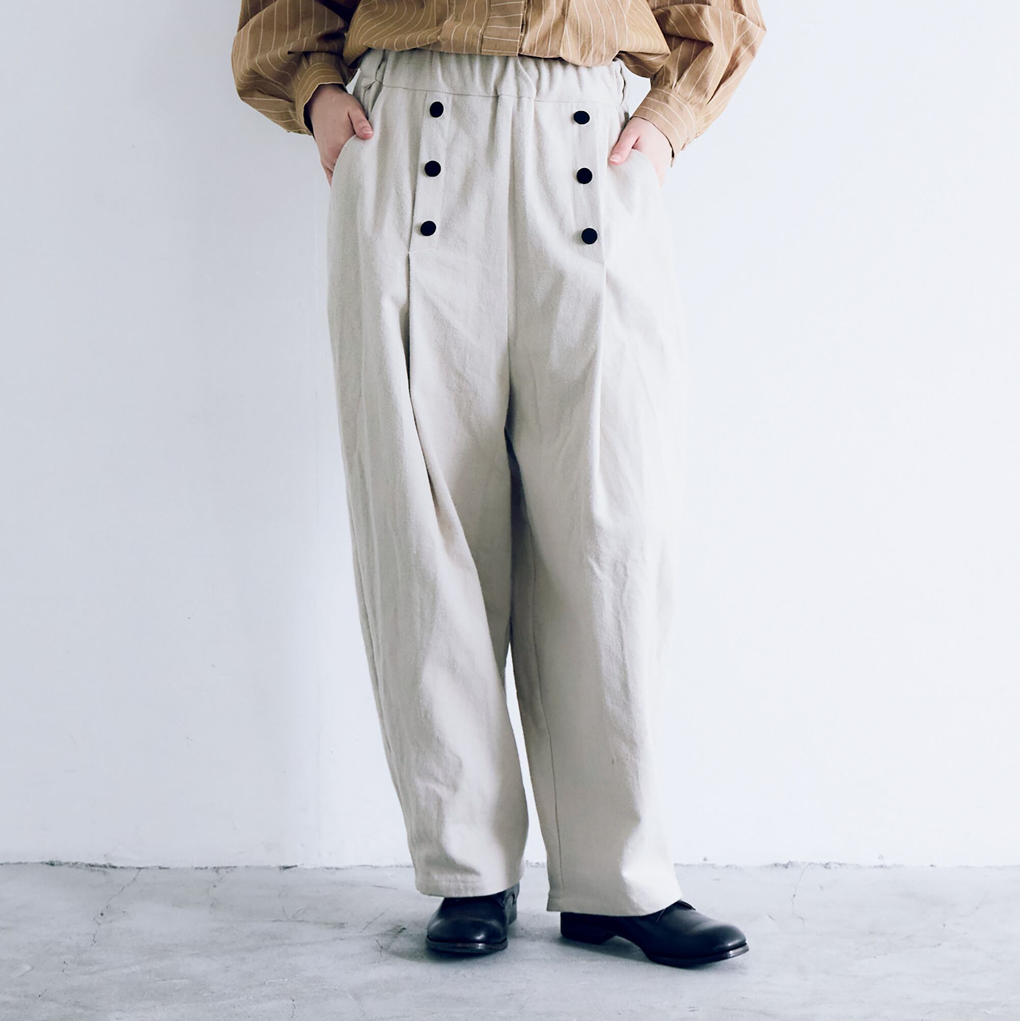 大きなタックには配色のくるみボタンをあしらい、まるでセーラーパンツのような趣きに。