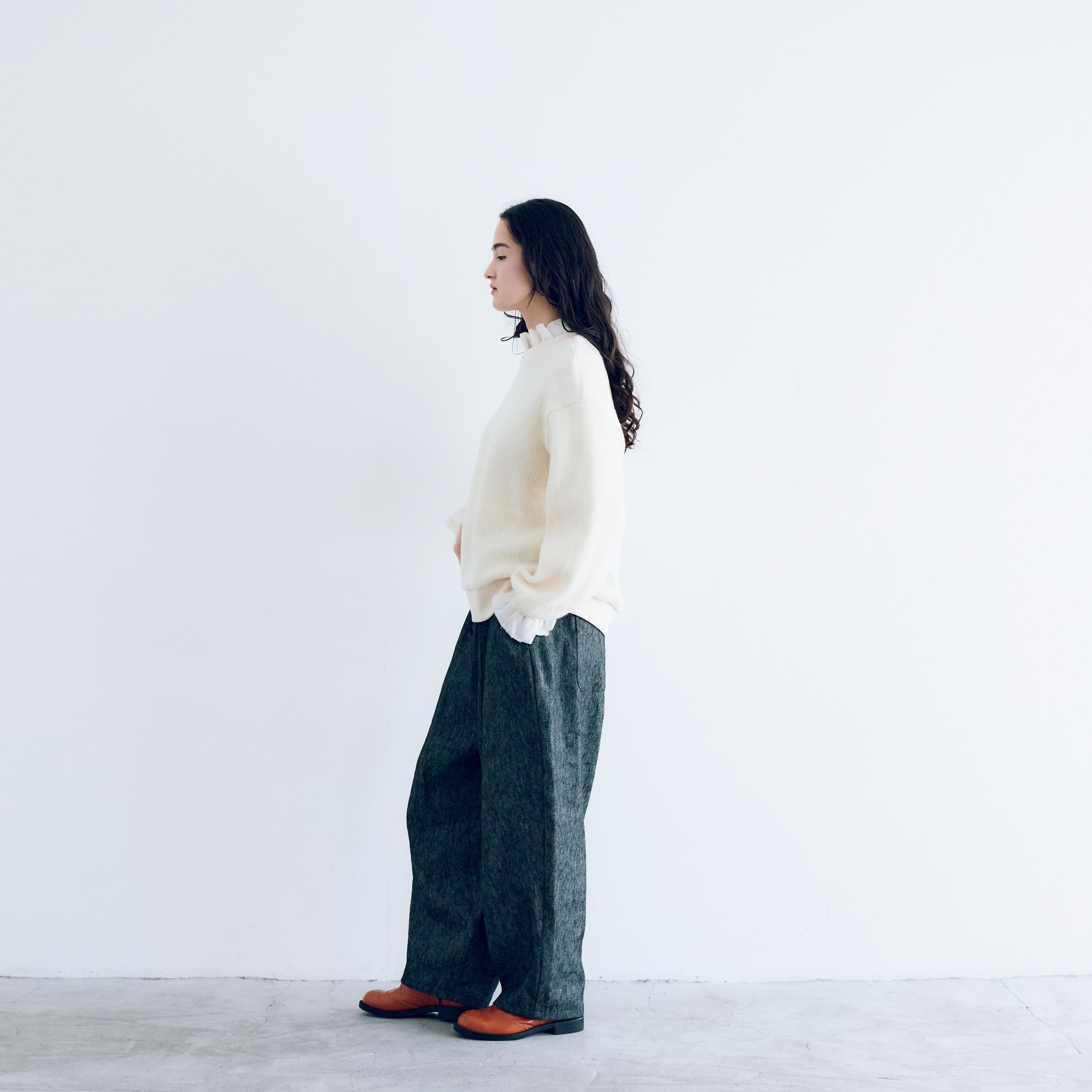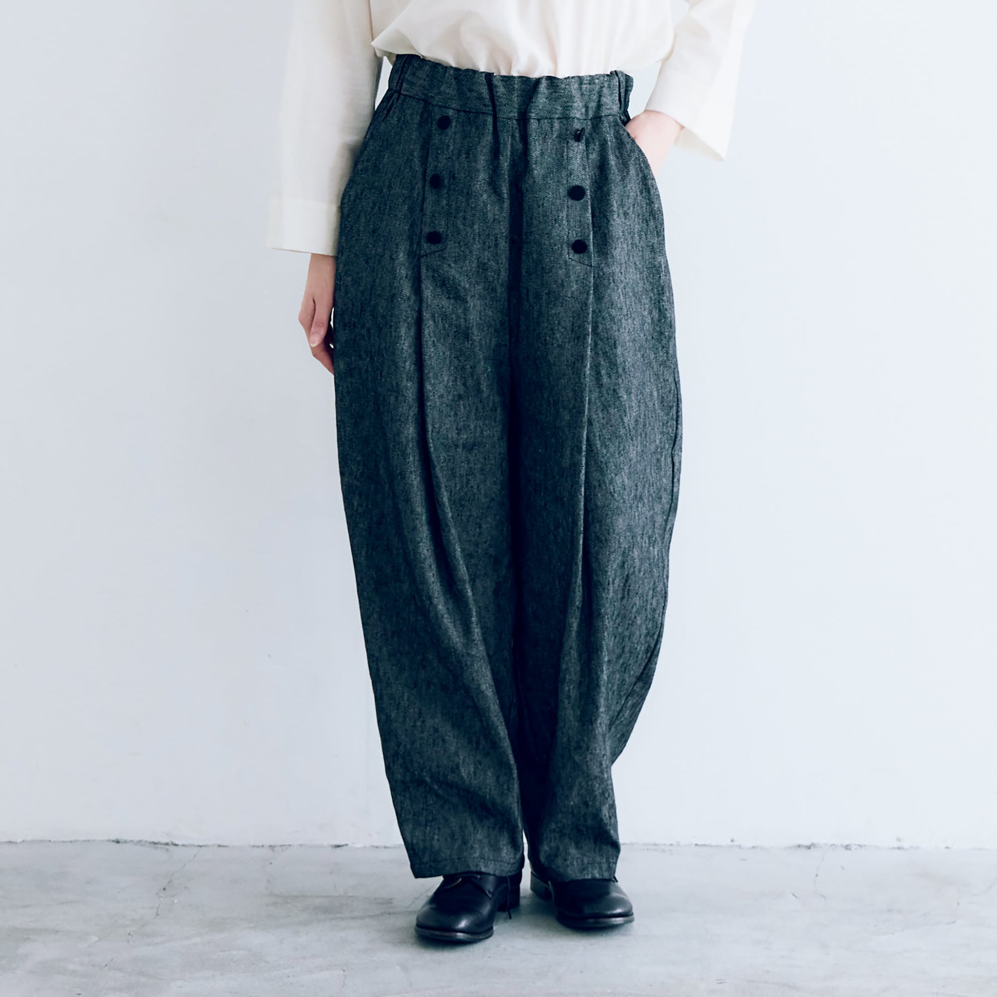 ブラウスやカットソーにも合わせやすく、着こなしをより楽しく豊かにしてくれるパンツです。