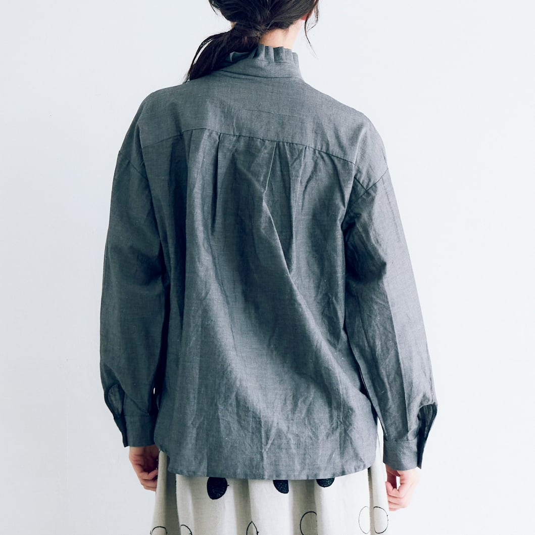 【MAGALI】コットンストライプ・ラッフルカラー・ブラウス/グレイ