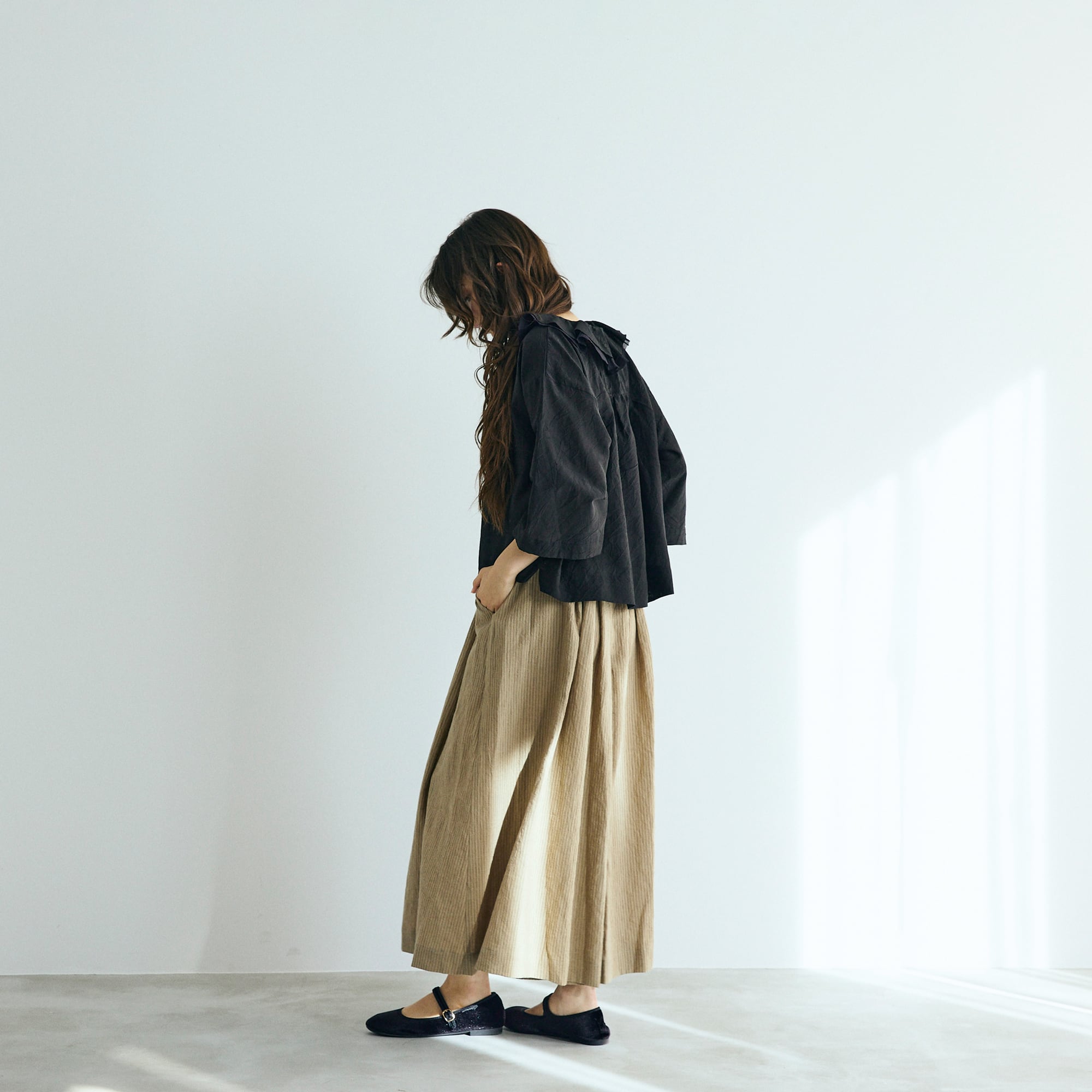 広めの袖口と程よい着丈が、全体のバランスを整え、重たさのない優しいシルエットを描きます。