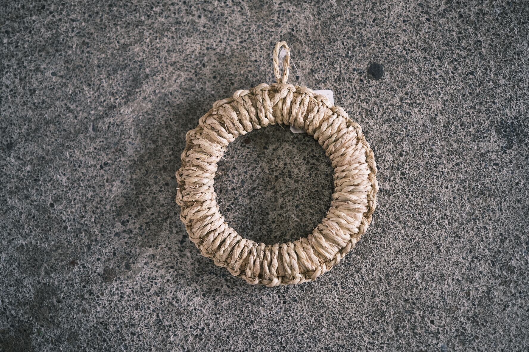 新潟県佐渡ヶ島でお米を取った後のワラで作られている釜敷き(鍋敷き)です。ひとつひとつ職人の手で作られた、丈夫な鍋敷き。輪っかがついているので台所の収納にも便利です。