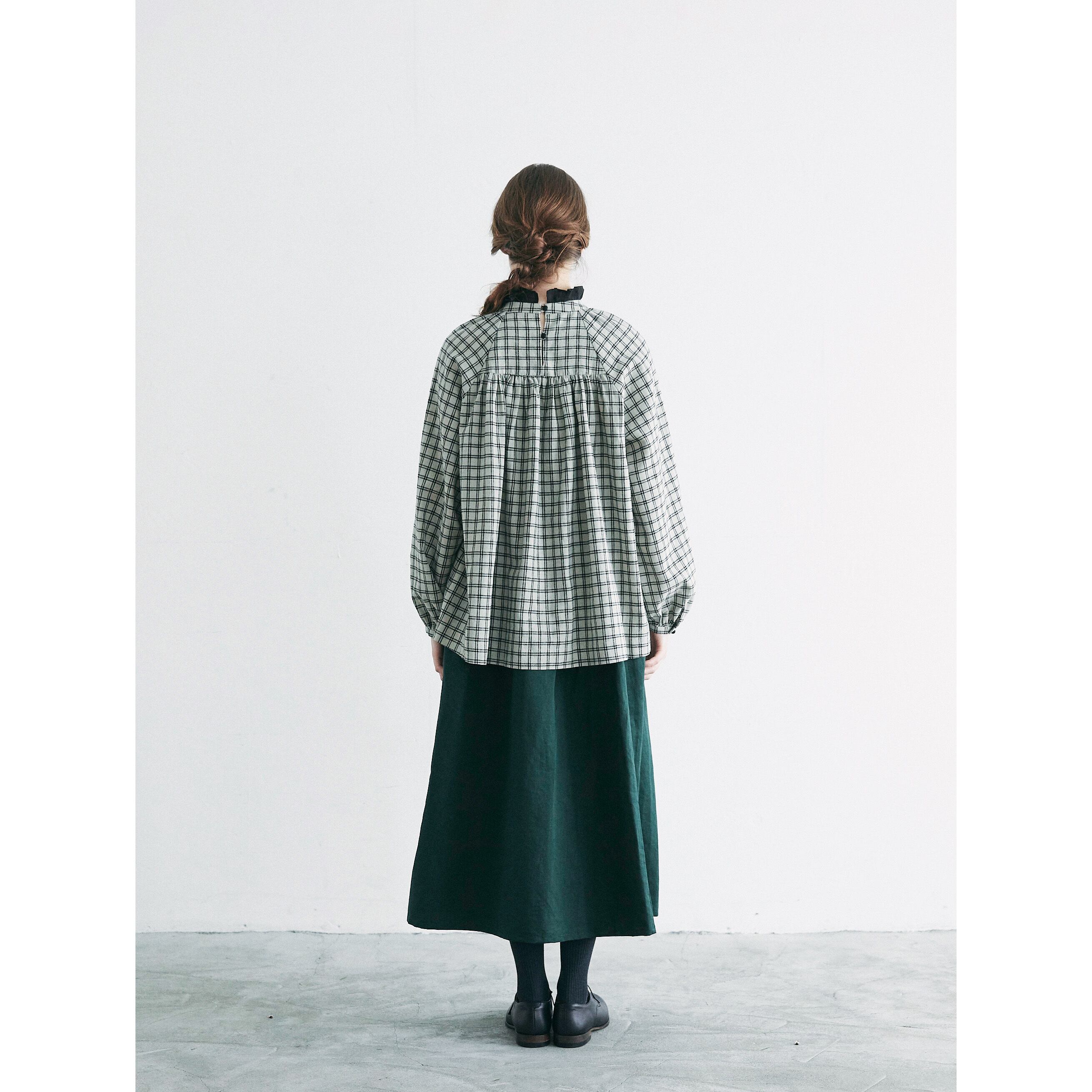 裾はストンと落としてそのままご着用いただいてもよいのですが、スカートやパンツなどのボトムスにインして膨らみを持たせて着用する着こなしもおすすめです。